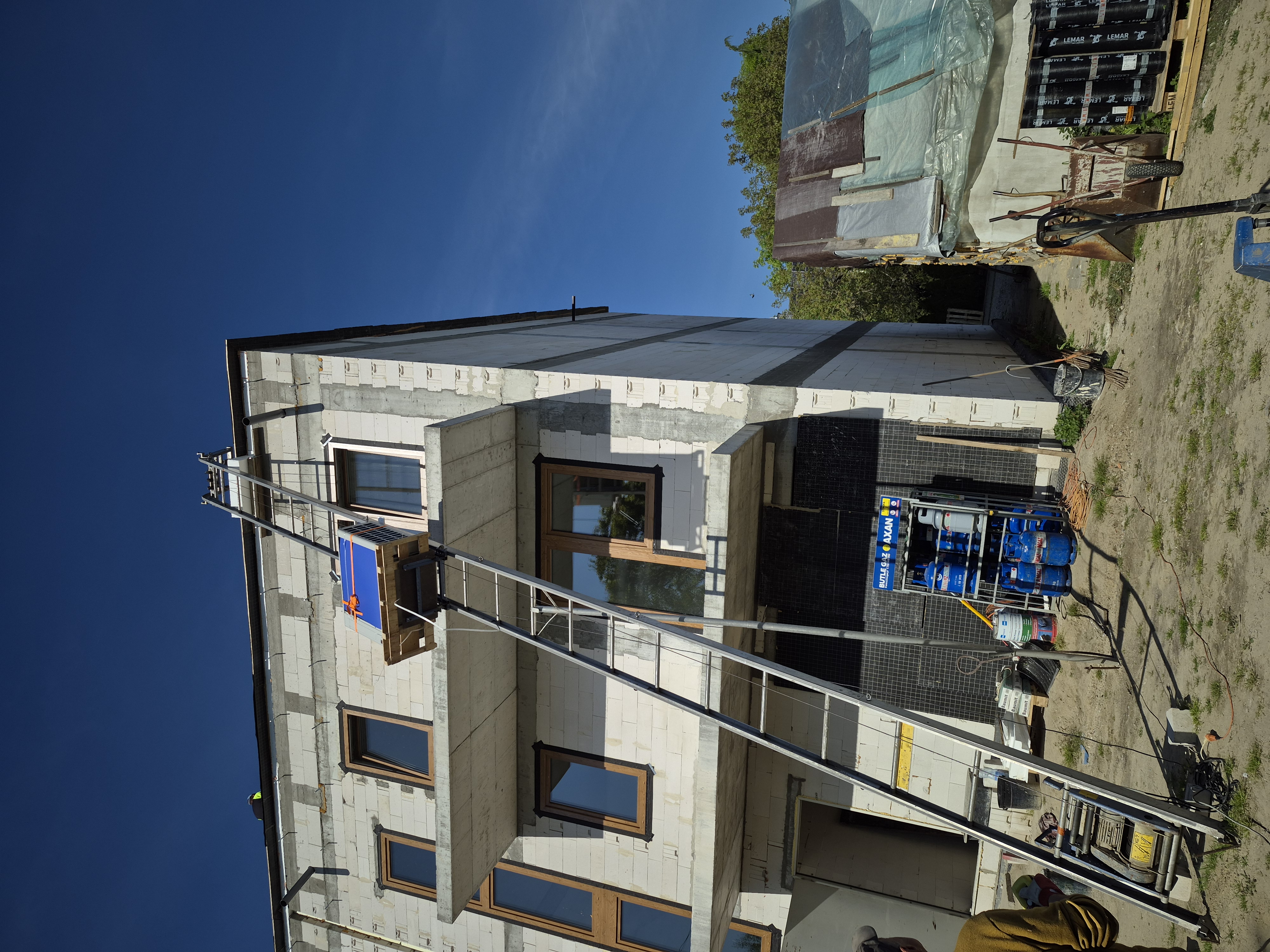 Zrealizowaliśmy niełatwy transport i montaż pompy ciepła na dachu budynku w trakcie budowy przy ul. Kłobuckiej na warszawskim Ursynowie (granica Wyczółek). Agregat pompy ciepła jest urządzeniem ciężkim (150-400 kg), więc jego wniesienie na dach budynku 4-5 kondygnacji wymaga specjalistycznego sprzętu — w tym przypadku użyliśmy windy dekarskiej.